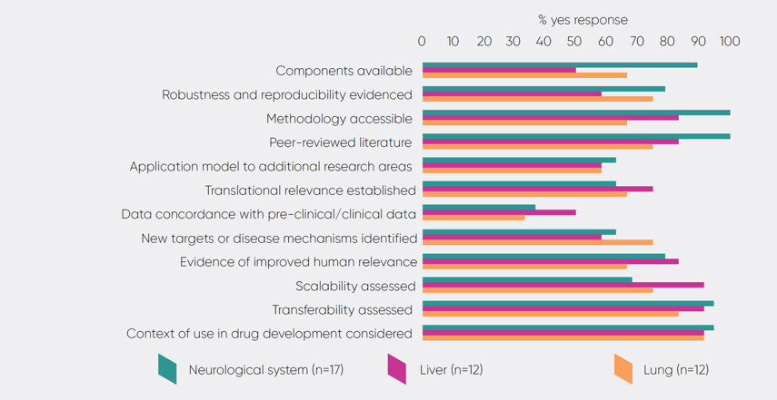 - The translational relevance. Evidence of translational relevance provide confidence that the model functions as it is intended to. Demonstrating translational relevance through clear translational endpoints was cited as a priority for several of the industry scientists consulted. 52 per cent of respondents reported that their models had been validated and could demonstrate translational relevance with clear functional endpoints. Where this had not been completed, additional feedback provided indicated that the work was ongoing or there was early evidence of this being assessed.